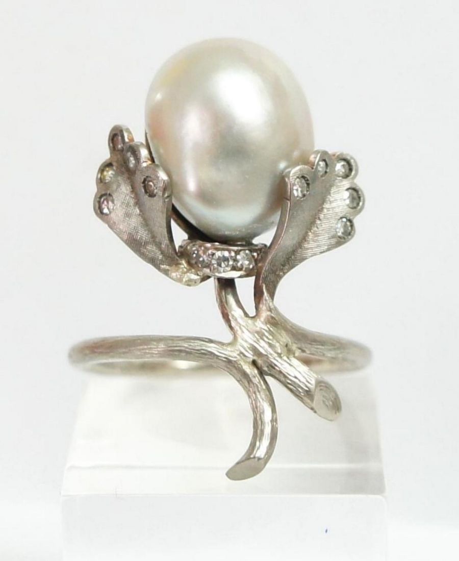 Im Stile eines Astes mit Blattwerk , wurde eine sehr grosse Südseeperle als zentrales Schmuckelement gefasst.