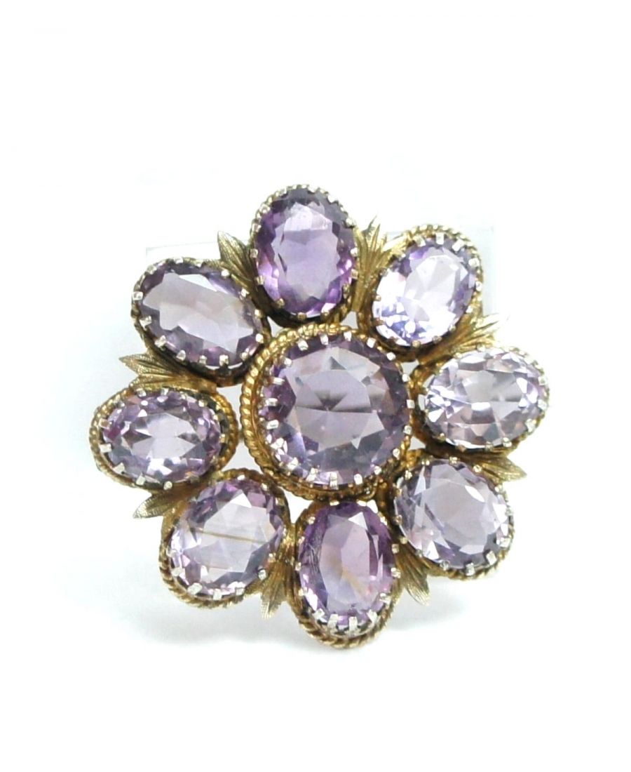 Die traumhafte Brosche ist vergoldet und es wurden in einer Art Blütenarragement grosse facettierte Amethyste gefasst.