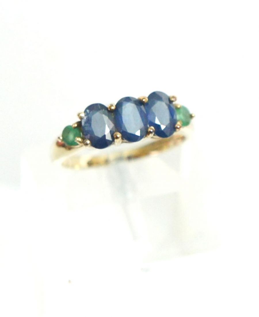 Besezt ist er mit 3 oval-facettierten blauen Safiren und als Abschluss je ein runder Smaragd.