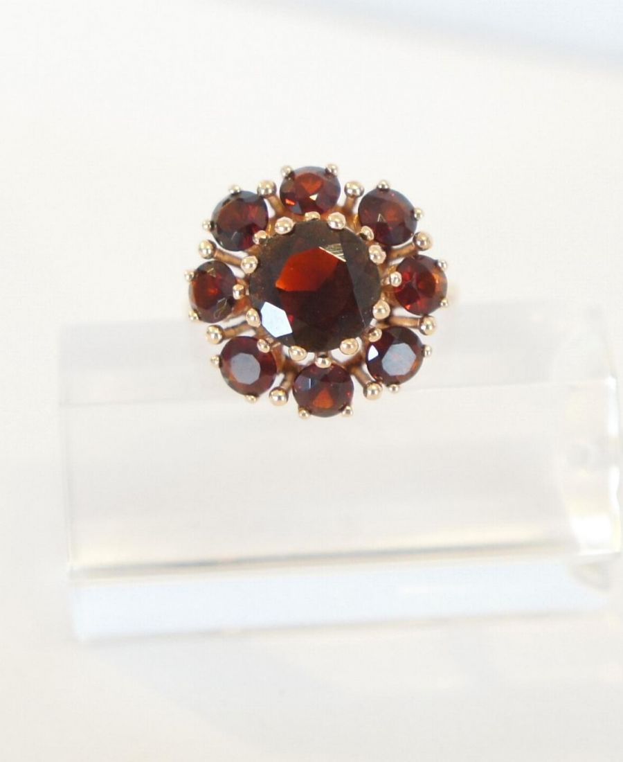 Edler, wunderschöner 585/000 Rotgoldring mit vielen böhmischen Granaten als Blüte besetzt.