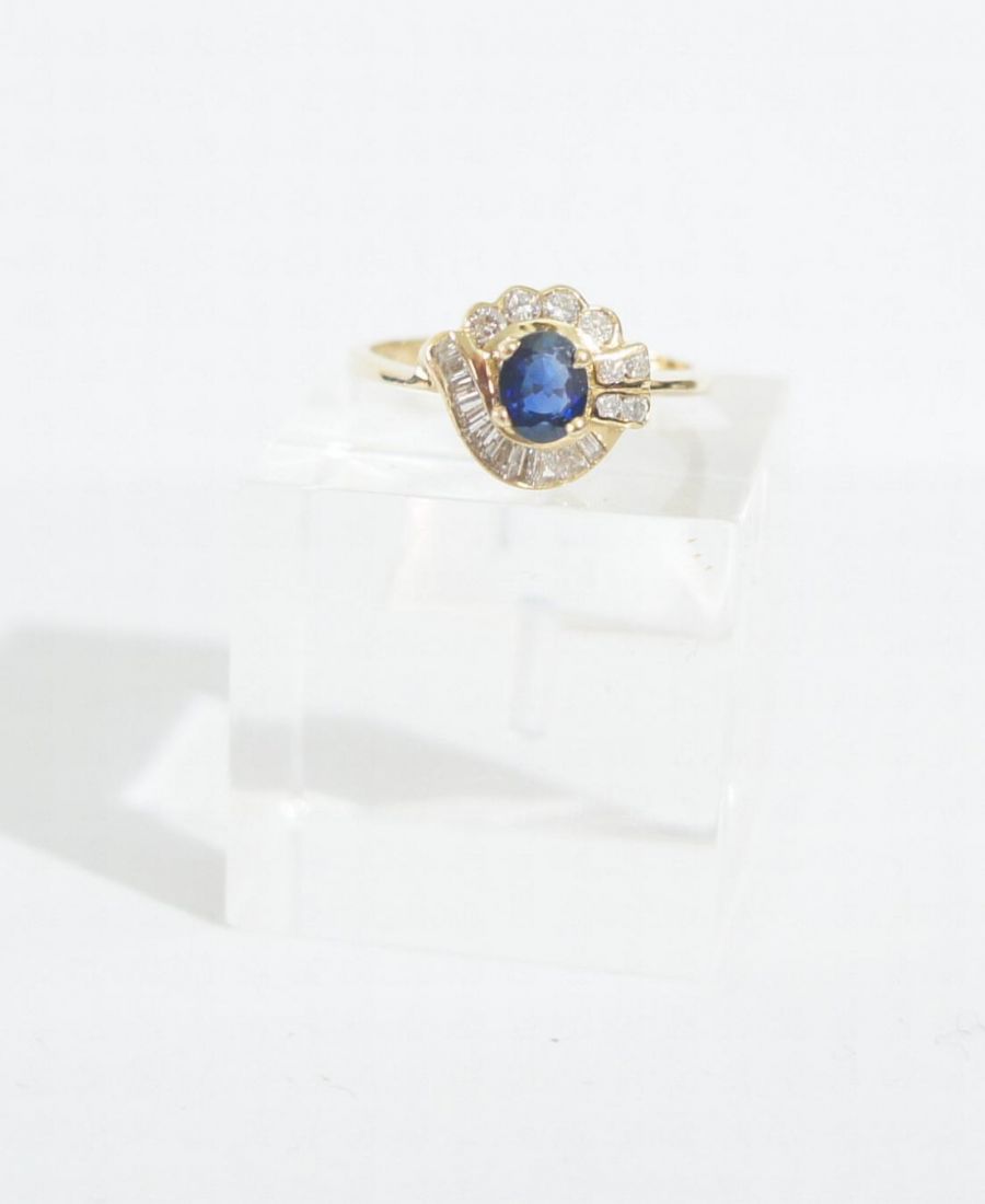 Der ovale Safir misst 5 x 4mm ( 0,40ct) die Diamanten im Brillantvollschliff ca .0,25ct und die Diamanten im Baguetteschliff ca.0,30ct.