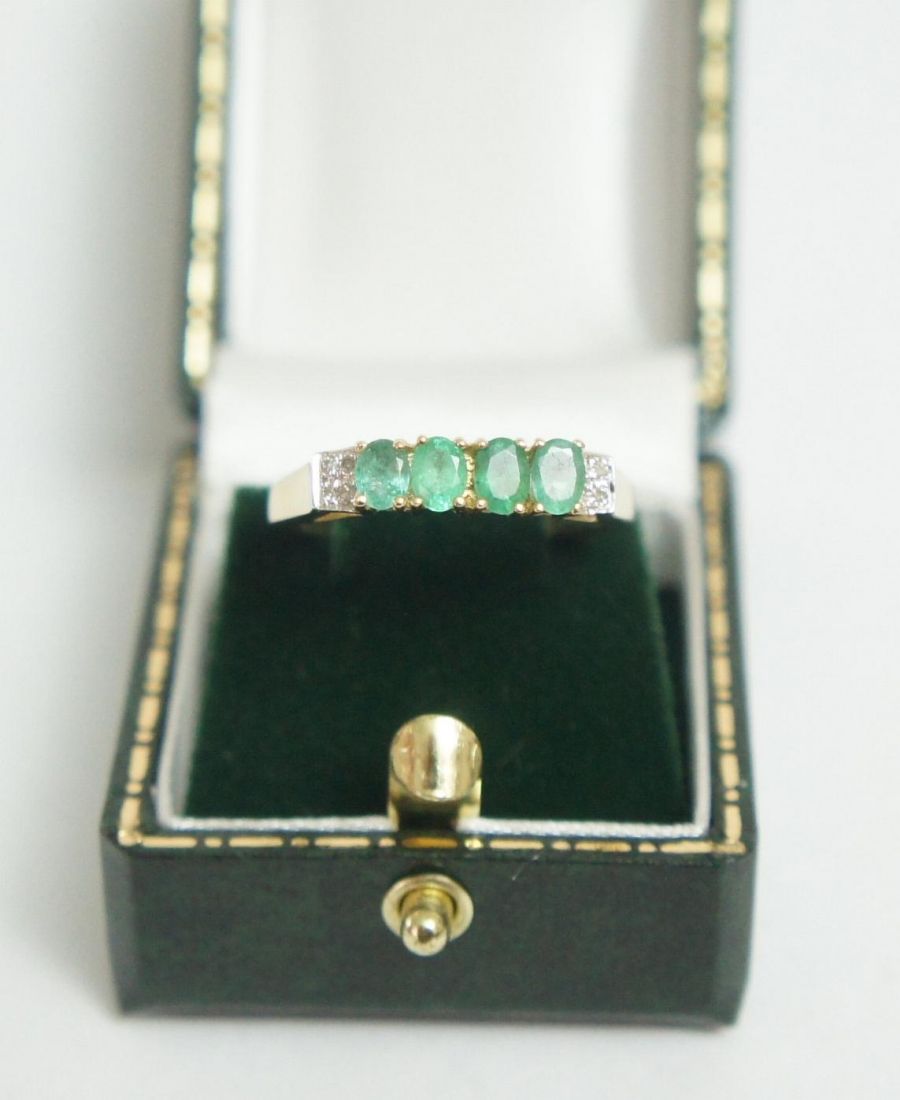 Es wurden 4 Smaragde im oval Schliff nebeneinenader gesetzt, links und rechts von ihnen wurden je 4 kleine Diamanten als Akzenststeine verwendet.