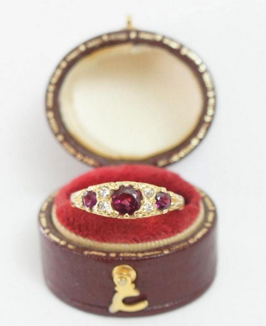 Im Ringkopf wurden 3 rund facettierte Rubine und 4 Diamanten im Altschliff verarbeitet.
