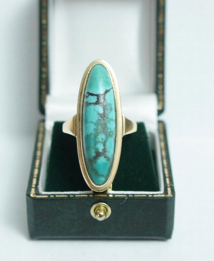 Der Ringkopf ist ein grosser länglich geschliffener Türkis, er ist komplett in Gelbgold eingefasst und sitzt sicher.