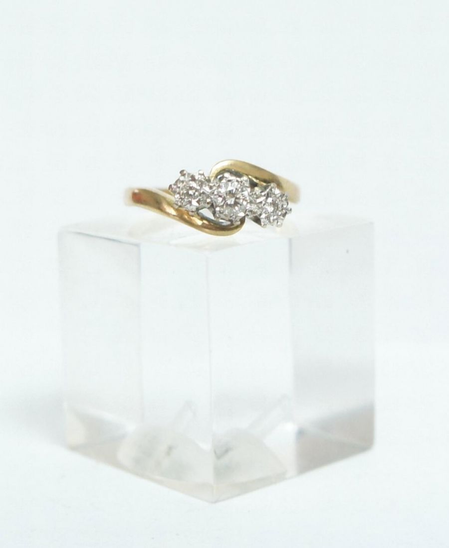 Gefasst wurden 3 Brillanten im Vollschliff , der mittlere Stein hat ca.0,15ct, die äusseren jeweils 0,05ct.